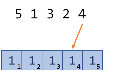我们按顺序去填充树状数组,第一个数字是5,这时没有数比5小,所以ans保持为0。我们把tree[5]填为1。