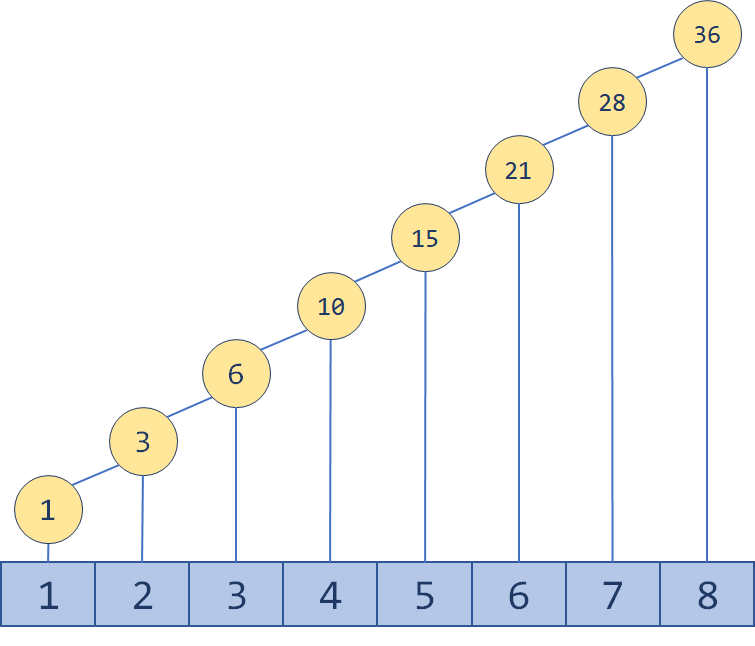 回顾一下,我们说,我们要实现两种操作:单点修改和区间求和。对于普通数组而言,单点修改的时间复杂度是 ,但区间求和的时间复杂度是