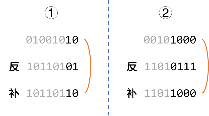 为什么可以这样?我们需要知道,计算机里有符号数一般是以补码的形式存储的。-x相当于x按位取反再加1,会把结尾处原来1000...的形式,变成0111...,再变成1000...;而前面每一位都与原来相反。这时我们再把它和x按位与,得到的结果便是lowbit(x)。下面的图中举了两个例子: